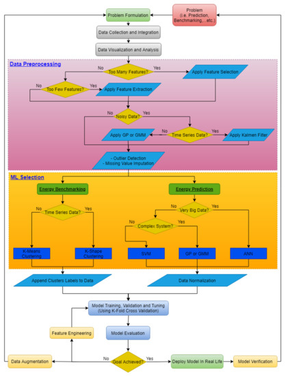 As shown in Figure 2, the generic ML covers all required steps to use and deploy the ML algorithms (i.e., ANN, SVM, GPR or GMM, and k-mean or k-shape clustering) in the energy and buildings field. The pipeline starts with problem identification (i.e., identify application type and specify the benchmarking and prediction problems). Then, this real-life problem must be converted to an ML problem in the problem formulation step by identifying the related features. After that, the data scientists start in collecting the data depending on the related features identified in the previous step and make some statistical analysis and visualization to study the nature of collected data and their distribution (this step is very important to help data scientists in choosing the appropriate preprocessing techniques).