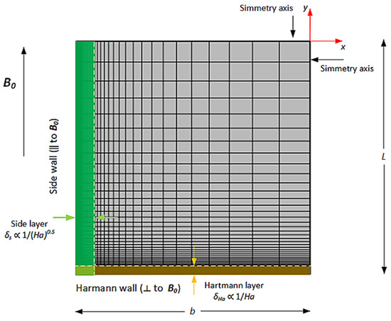 The symmetry of the problem is exploited, and only a quarter of the duct cross section is considered. The mesh is constituted by a symmetric distribution of elements in the direction of the flow, maximizing the number of cells in the central region, where the magnetic field is changing the most. In and directions, the mesh is analog to the one proposed in Section 3.1. The total number of elements is . The equations are solved in dimensionless form.