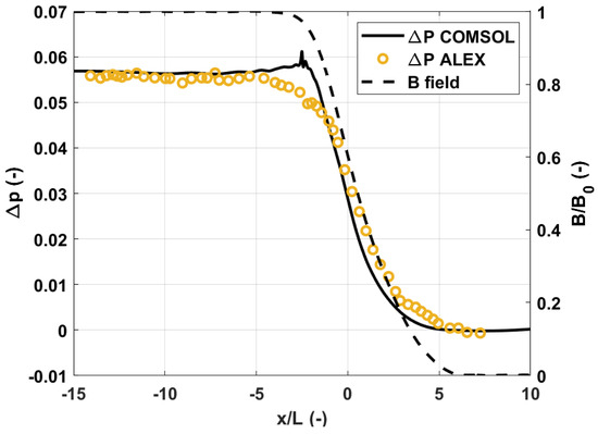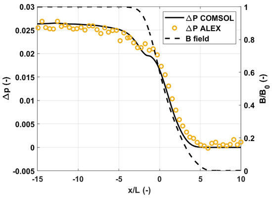 The parameters adopted for the study are , and . The quantity selected for the comparison with the experimental results is the dimensionless axial pressure difference, that is, the pressure difference developed in the axis of the duct, scaled by . The results are presented in Figure 2, where the magnetic field profile scaled by and the axial pressure difference obtained by Picologlou et al. [22] are shown in the present work. Good agreement between the curves can be appreciated. The biggest discrepancy appears in , where COMSOL tends to overestimate the pressure difference. This behavior is also found in work by Sahu [8] and from the HIMAG Code calculations [26,27]. The difference between the two solutions is calculated using the integral of the curves with the following relation, called integral error index: