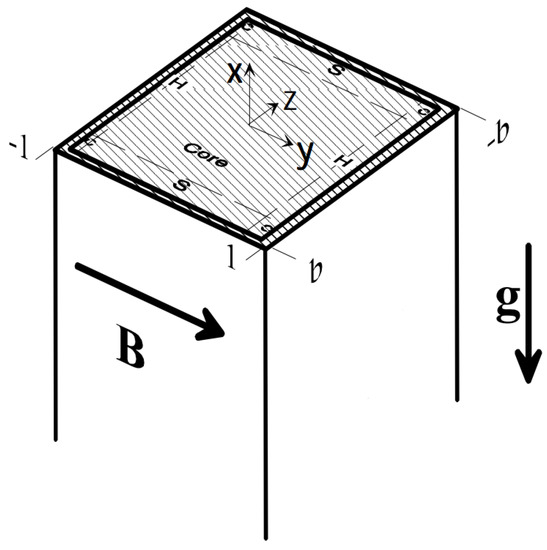 The flow of an electrically conducting fluid in a long vertical channel of the rectangular cross section was considered [16]. The flow is promoted by buoyancy forces arising from non-isothermal conditions; hence, we refer to this as magnetoconvection. With reference to Figure 4, the imposed magnetic field is and the gravitational acceleration , with unit vector in -direction, is aligned with the channel axis. Within this frame, two cases are considered: a differentially heated duct and a uniformly heated duct, solved by Di Piazza and Bühler [18] with the CFX commercial code (currently Ansys CFX). For both the problems, the Hartmann number is .