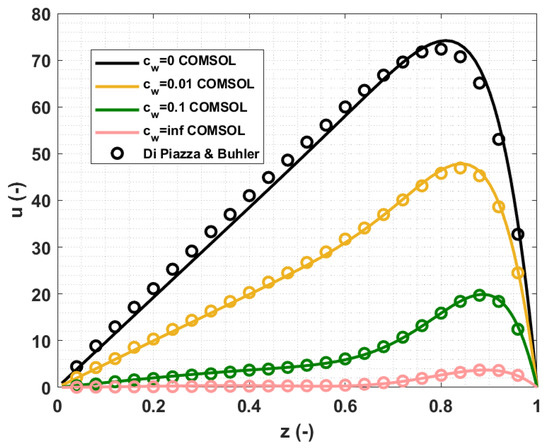 where (−) is [18] -direction dimensionless velocity profile and (−) is the current work profile, both taken at . The error comparison is reported in Table 2. As can be appreciated, for all the cases, the maximum difference is lower than 2%.