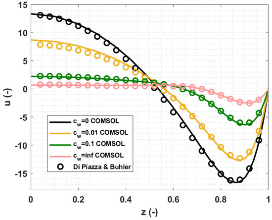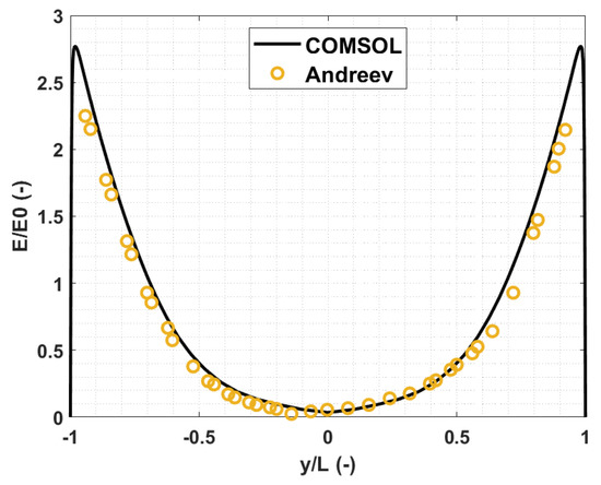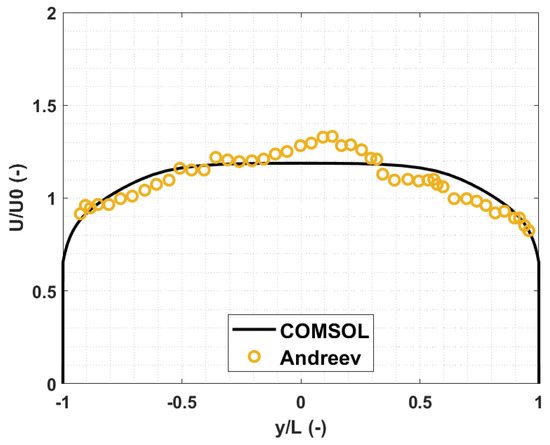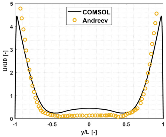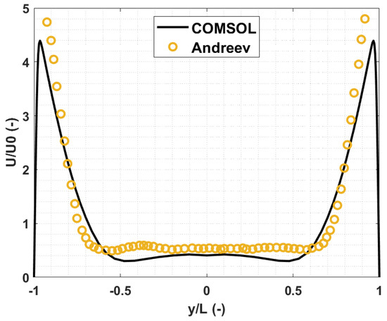 The selected comparison parameter is the mean velocity profile and the mean electric potential, evaluated at different distances along the channel. In particular, the selected locations correspond to the main flow regions, as described by Andreev. In Figure 9, a comparison between COMSOL and Andreev’s velocity profile at , with channel height in -direction, is presented.