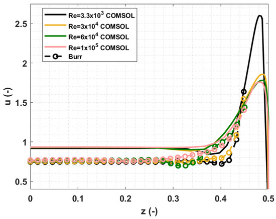 The mean velocity in -direction , calculated for and various Reynolds numbers, is now compared with Burr results. In Figure 7, the COMSOL solutions and Burr experimental results are displayed.