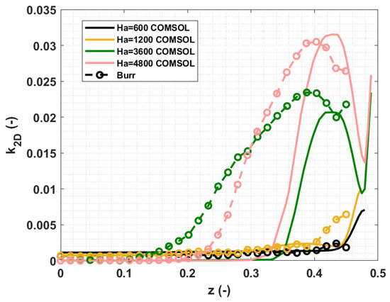 In Figure 8, the comparison between the distributions of the turbulent kinetic energy of two-dimensional turbulence reported by Burr [13] and calculated with COMSOL are presented for and Hartmann numbers between and . The values are captured along the -axis at the midplane . The increase in the turbulent kinetic energy as increases can be appreciated, proving that turbulence is promoted by the magnetic field. In both [14] and COMSOL results, turbulence is restrained to the side layers, decreasing fast moving towards the core region, where, in the experimental results, the flow, although weakly, remains turbulent. The anisotropicity of the turbulent flow is particularly evident for the high Hartmann number cases, where .