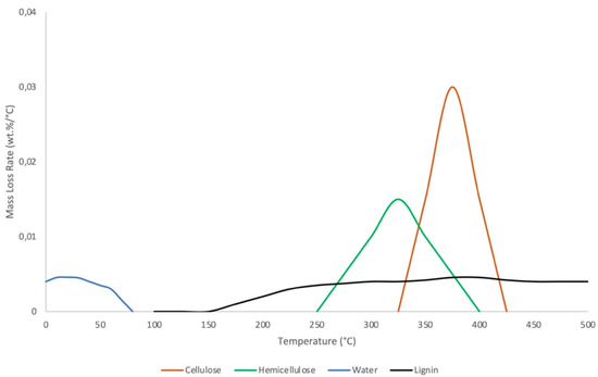 The rate of thermal decomposition of cellulose, hemicellulose, and lignin with moisture/water operating within pyrolysis temperature. Adapted with slight modifications from [14].