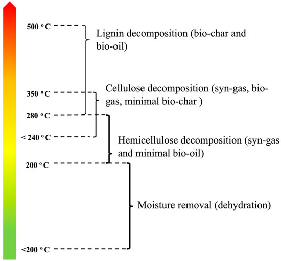 Understanding the decomposition behavior of the main biomass requires useful knowledge about its properties and structure, particularly in the context of moisture status and the specific temperature points in obtaining different pyrolysis products. To throw more light on this, the rate of thermal decomposition involving cellulose, hemicellulose, and lignin with moisture/water operating within pyrolysis temperature is shown in Figure 2 [31]. The temperature ranges within the pyrolysis process reflect different layers of biomass structure. Given that these three main layers are understood to pyrolyze at different temperature ranges, the emergent products would be achieved at specific temperature levels. Previous studies involving approximate and ultimate analyses have shown the fundamental fuel trademark to be among effective ways that relate to general properties of biomass composition, particularly with regards to ash, carbon, hydrogen, oxygen, nitrogen, sulfur, moisture, and volatile matter [56]. Volatiles and ash presence might affect the pyrolysis reaction, and, therefore, it would result in a considerable effect on the quality and bio-oil yield [16,22]. When the volatile content is higher, it is subjected to high volatility, and this could change the characteristics desired of bio-oil production [56]. However, the ash content lowers the calorific value of the feedstock and subsequently impacts the production of bio-oil. A higher water content results in an increase of the aqueous phase under the pyrolysis process, which will cause a reduction of calorific values of the biomass-derived bio-oil. Furthermore, the carbon burn rate is considerably lower during the process [22,24].