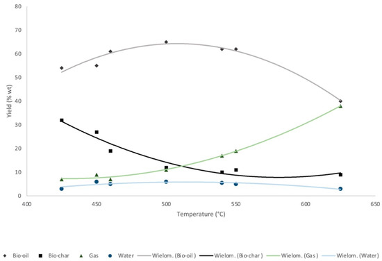 The way in which temperature impacts bio-oil production appears to be more complex. This is because the bio-oil yield suggests the gross of organics/water yields. Hence, the best way to achieve that is to look at the yields of water and organic liquids independently. Mostly when the pyrolysis process is operating at a range between 400 and 600 °C temperature level, the yield of the organic liquids tends to achieve a peak value under specific temperature, but it depends on the feedstock type. In the case of wood feedstock, usually, the maximum temperature is 500 °C. The influence of temperature on bio-oil qualitative characteristics was investigated by Elliot [62], who characterized a fast pyrolysis process with a short residence time. In that study, the chemical composition showed a direct association with the process temperature [62]. Despite this, the temperature increase would feasibly decrease the released oxygen content [55]. Additionally, the pyrolytic gas increases with temperature but decreases in bio-oil, biochar, and water [29].