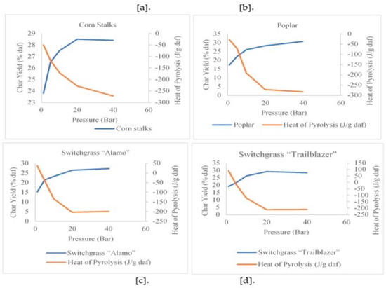 Pressure is a significant factor in the fast pyrolysis of biomass, given its influence on product yield. Generally, critical parameters involved in fast pyrolysis include a high rate of heat exchange to the biomass and a speedy removal of initial biomass feed composition/products, which results in an increase in liquids yields and a reduction of biochar yield. Many studies have shown that increasing pyrolysis pressure would result in proportionally more oil with decreased gas yield. Higher pressure would lower the obtained gas product yield [63]. By using three different pressure values, 5, 10, and 20 bar, to generate char samples without change in temperature condition, the pyrolysis pressure would have a demonstrated impact on the shape and size of particles, through the proportional rise in the void and reduction in thickness of a cell wall. Most swelling occurs at pressures with low values, whereas an increase of the pressure of pyrolysis would lead to bubbles forming with the increased size of biochar particles [64]. Another study that used four types of biomasses, namely poplar, switchgrass Alamo, switchgrass Trailblazer, and corn stalks, evaluated the relationship between heat and high-pressure values of pyrolysis by proximate analysis equation, and the resultant outputs are shown in Figure 4 [1]. The process pressure would noticeably affect the biochar yield. This is governed by pressure rising from 1 bar to 5 bars, which resulted in increased biochar yields from 23.8% to 28.3%, from 17.3% to 30.7%, from 15.2% to 27.3%, and from 19.1% to 28.5%, for corn stalk, poplar, Alamo, and Trailblazer, respectively. An increase in pressure in all biomass samples would shift the process from an endothermic to an exothermic reaction [1].