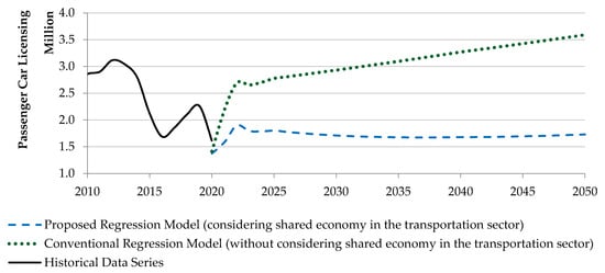 Figure 2 shows the projection of passenger car licensing over the analyzed period, based on the linear regression model. For comparison purposes, in addition to the projection from the proposed regression model, the projection of the conventional model is also illustrated in Figure 2. This conventional regression model is similar to the proposed one, but does not consider the effect of shared economy services in the transportation sector (that is, it does not consider the “” portion of Equation (5)). The values of the coefficients and statistics of the conventional regression model are presented in Table A2, in Appendix A. Note that this conventional model is also statistically robust, but considering one less regressor than the proposed model affects the R square, providing a projection that is not as accurate as of that of the proposed model. Even so, the comparison between the projection behaviors of both models provides relevant results, revealing that the non-consideration of shared economy services in the transportation sector may indicate an unrealistic linear increase in passenger car licensing after 2023.
