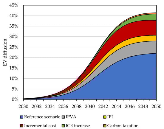 Another important aspect in the analysis of the impact of public policies in the diffusion of any technology is the duration of the policy. Maintaining public policies to stimulate EV sales for a long period can be costly for both the government and the automotive market. However, the early removal of public policies can directly affect sales [,]. Kong et al. [], for example, investigated the effect that multiple public policies could have on EV diffusion in China when purchase subsidies are discontinued. However, these authors worked with scenarios considering constant rates during the analyzed period. Additionally, the scientific literature usually considers the total use of internal combustion engine (ICE) vehicles as the potential market. Indeed, this simplification is reasonable when EV prices are competitive with those of ICE vehicles. However, this analysis in countries where the EV acquisition cost is high may distort the results of the diffusion.