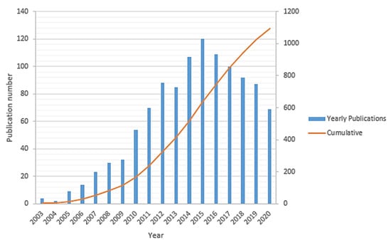 Sufficient access to clean energy sources is one of the ongoing key challenges for global development that directly impacts industrial development, economic growth, and human well-being. Historically, the energy sector is widely dominated based on fossil fuels (such as petroleum fuels, natural gas, coal, etc.), which are the primary sources of carbon dioxide (CO2) and other greenhouse gases emissions in the environment. This has fundamentally driven a global climate change that has been accelerated over the past few decades and hence needs significant and immediate actions in order to alter both the energy sources and energy conversion techniques. There is a growing movement by the research and manufacturing communities to alleviate the impact of the petroleum-based economy by developing clean energy sources for implementing an alternative hydrogen-based economy [1,2,3]. Developing new clean energy supplies requires abundant access to sustainable energy sources. Thus, the energy storage systems such as lithium-ion batteries, redox flow batteries, and other fuel-cell-based power-to-gas technologies should be well integrated side by side, while developing the new capabilities of renewable energy sources. The lithium-ion battery is one of the most promising energy storage candidates in the portable and auxiliary device markets due to its high power density, environmental friendliness, and long service life [4]. By contrast, redox flow (cell) batteries can be used for large-scale energy storage applications. Their unique design leads to a higher power-to-capacity ratio from about 1:10 to 1:4. However, their toxicity, corrosivity, and high costs of the electrolyte solutions as well as low charge/discharge rate (1–10 h) and relatively low energy density have limited their applications [5,6,7]. Given the current environmental challenges associated with fossil fuels, fuel cell technology has been introduced as a promising, cleaner, high energy density, and more efficient power generation system [2,8,9]. The first fuel cell to operate with hydrogen and oxygen was developed about 150 years ago by Sir William Grove and was then further studied by developing many other sorts of fuel cells within the 19th century [8,10]. Lately, polymer electrolyte membrane (PEM) fuel cells, which directly convert the chemical energy of hydrogen into electrical energy, were predominantly developed as the most common commercial fuel cell [11,12]. Hydrogen gas (as a fuel with the highest energy density) and oxygen (usually taken from the air) are being used in a PEM fuel cells over the surface of electrodes to produce water through a few electrochemical reactions that are associated with the electrical power generation [13]. Structurally, a PEM fuel cell is comprised of an electrolyte layer at the middle integrated with anode and cathode electrodes over that, along with a current collector layer on top of each side of the cell. The polymer electrolyte membrane is a protonic conductor and electronic insulator sandwiched between a pair of electrodes [14]. The PEM fuel cells are classified into two important types, including low-temperature PEM (LT-PEM) and high-temperature PEM (HT-PEM) fuel cells [15,16]. Direct ethanol fuel cells [17] and direct methanol fuel cells [18] are the subset of PEM fuel cells. Figure 1 summarizes the trend of the total publication records (yearly and cumulative) in “HT-PEM fuel cell” according to the “Web of Science” indexing database till September 2020. This histogram shows gradual growth of the number of publications starting in 2003 and reaches about 1100 papers in 2015, followed by an almost linear decline in the past few years.