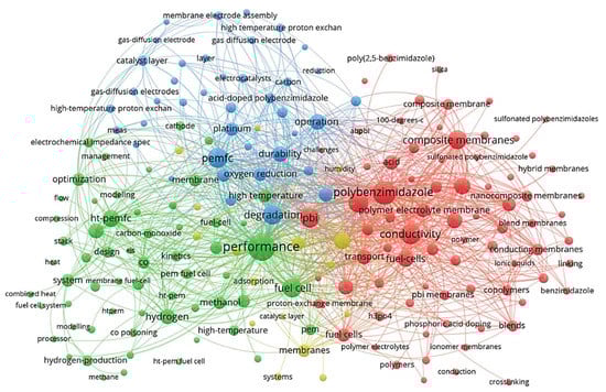 VOSviewer application [19,20] (a social network analysis software) was used to qualitatively analyse the network of the published records in the HT-PEM subject within the last couple of decades. The main keywords that have received at least ten occurrences were identified and used to map a connection network model represented in Figure 2. This map reveals the main keywords and categorises them in accordance with their co-occurrence. The size of each node represents the relative importance of a keyword in the literature, and the distance among keywords implies the probability of co-occurrence and relatedness. According to this figure, the most frequent keywords regarding HT-PEMFCs are related to their performance, conductivity, polybenzimidazole (PBI) membranes, acid, composite/nanocomposite membranes, and cell degradation/durability. Many researchers have focused on the performance of cell performance and improving cell conductivity. PBI does not have proton conductivity without acid doping; acid-doped PBI membranes showed the promising electrochemical performance to be used in high-temperature applications [21]. Another practical approach for improving cell performance is the fabrication of polymer composite/nanocomposite membranes which can improve proton conductivity, water uptake/retention, thermal/chemical durability, mechanical strength, etc. [22,23,24].