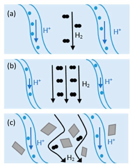 Proton and H2 transport at (a) 80 °C, (b) at elevated temperatures, and (c) in Nafion composite at high temperatures. Reproduced from [59], MDPI: 2020.