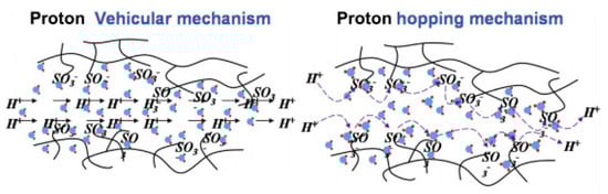 Numerous reports have studied the proton conduction mechanism in PEM fuel cells; however, the exact mechanism of proton conduction in the PEMs has not been fully recognised and understood yet. Among the various theories introduced so far, the ‘vehicular’ and ‘Grotthuss’ mechanisms have been more commonly approved to explain the proton transfer mechanisms in PEMs [94,95]. Usually, the PEMS with activation energy below 14 KJ.mol−1 can be explained better with the ‘vehicular’ mechanism, while those exhibiting higher activation energies are better represented with the ‘Grotthus’ mechanism [96]. In fact, the proton transfer explained by both the ‘vehicular’ and Grotthus mechanisms does not act independently in PEMs. Both theories can make helpful assistances to better understand the proton conduction mechanism in PEMs. The proton transfer happens with a ‘vehicle’ or proton solvent (for example, water molecules as hydrates in the PEM molecular structure) that provides a suitable diffusion rate in the ‘vehicular’ mechanism [97]. In the ‘Grotthuss’ mechanism known as the ‘hopping’ mechanism, a vehicle or proton solvent is not essential. Protons could simply jump from one site to another alongside the proton acceptor sites in the PEMs backbone [27,98]. Figure 4 displays a schematic diagram illustrating both the ‘vehicular’ and ‘hopping’ mechanisms for proton conduction paths in PEMs [99,100].
