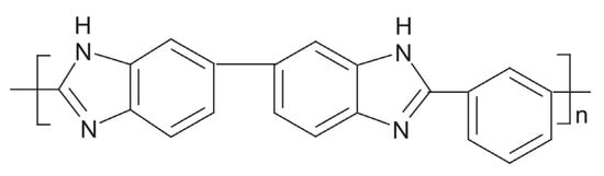 In general, achieving an acceptable electrochemical performance with a PEM fuel cell requires a high proton conductivity in its heart, which is a PEM layer [121,122]. The use of the Nafion membrane as the most widely used PEMs is limited due to its high cost, comparably large fuel crossover, poor mechanical reliability, and the risk of polymer structure rupture at the operating temperatures above 100 °C [123,124]. On the other hand, HT-PEM fuel cells offer many benefits, such as providing more prominent working voltage, alleviating the effect of CO poisoning in electrodes, and gaining better cell efficiency [125]. PBI has been reported to be used in the HT-PEM fuel cell membrane because it can provide excellent chemical, thermal, oxidative, and hydrolytic stability at high temperatures [126]. Figure 5 shows the chemical structure of PBI, which is one the most common material used in HT-PEMs.