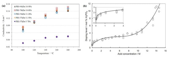 Graphical representation of (a) proton conductivity of PA doping of different molecular weight of PBI membrane at different temperatures (Reproduced from [57], Elsevier: 2014); (b) the PA doping level rate of different concentrated PA-doped PBI membrane at room temperature; (Reproduced from [46], Elsevier: 2004).