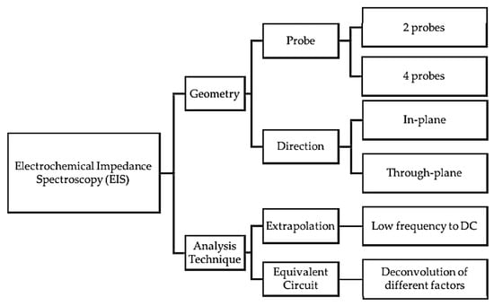 In addition to the in situ and ex situ analyses, several methods have been employed to measure the electrochemical impedance spectroscopy (EIS) of the PEMs, including in-plane, through-plane, two-probe, four-probe, etc. A summary of the different possible configurations (geometry and analysis techniques) for the EIS measurements is shown in Figure 8.