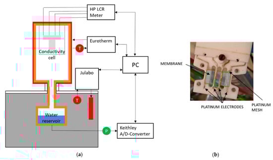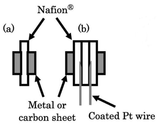 In-plane conductivity () measurement is a technique in which two platinum plate electrodes and a sheet of the sample (membrane) are mounted on a Teflon cell, and two parallel Pt electrodes are placed on one side of the membrane. To measure the proton conductivity in liquid water or at relative humidity lower than 100%, the cell is placed in a distilled deionized water or a humid chamber with controlled humidity (thermos-controlled humid chamber), respectively. In-plane conductivity can be calculated as follows [214,215,216,217]: