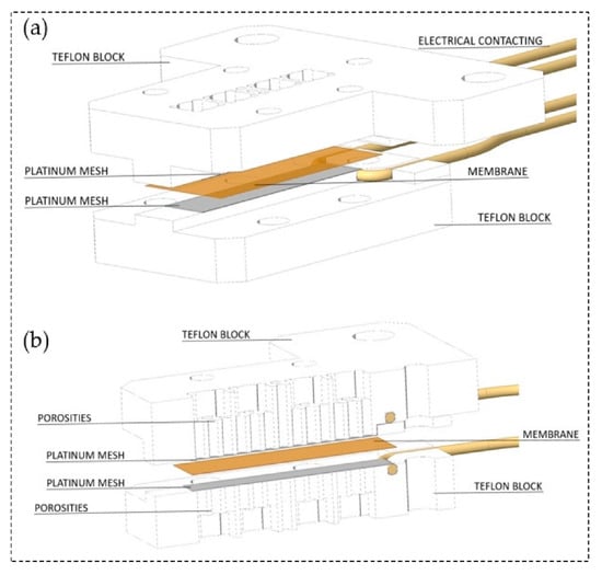 where t is the thickness of the membrane, A is the effective area of the electrode, and R is the membrane resistance. A sample arrangement of the through-plane test setup configuration is shown in Figure 10.