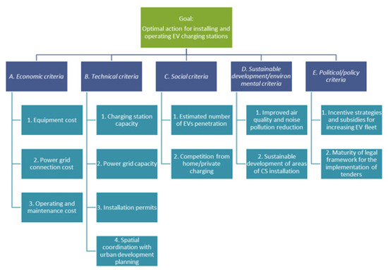 The literature review conducted in Section 2.1 ‘Charging infrastructure for EV’ reveals a list of significant economic and technical factors to be considered in the decision-making process for the charging infrastructure market. However, in addition to these essential technoeconomic parameters, a wider consideration of factors should be made due to the public dimension of the EV charging infrastructure. In their research regarding the public project selection criteria based on a multicriteria decision analysis, Bellos et al. [44] highlight the importance of social and political criteria and use the following six clusters of criteria: Economic, political, social, sustainable development (environmental), and technical. With regards to applying a multi-criteria decision-making method for the optimal siting of charging stations from the sustainability perspective, Zhao & Li. [45] also include social and environmental factors. In this research paper, the above-mentioned six clusters are applied, and the sub-criteria are identified in the literature.