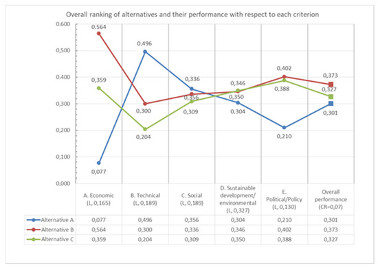 The consistency check is a tool for the quality control of judgmental data. In addition, the AHP method enables the examination of the results by performing a sensitivity analysis. The purpose of the sensitivity analysis is to determine how changes in the factors importance affect the result. The sensitivity analysis for the proposed model is performed in the Expert Choice® software and changes of 50% in the priorities of all criteria clusters did not affect the optimal option. The importance degree of economic criteria should be reduced to 0.021, a percentage change of 87.3%, to change the overall ranking with Alternative A as the optimal action. Similar extreme changes should be performed for the technical, social, and sustainable development/environmental criteria to affect the final ranking. For example, the priority of the technical criteria should be increased from 0.189 to 0.417 (percentage change of 120.6%) to result in Alternative A as the optimal action. Regarding the political/policy criteria, no range of change affects the overall classification.