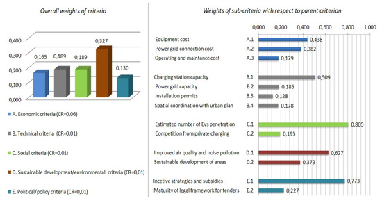 The weights of criteria and sub-criteria with respect to the parent criterion are presented in Figure 3. Participants gave the highest importance score (0.327) at the sustainable development/environmental criteria. Next and equally important (0.189) are the technical and social criteria, followed by the economic criteria (0.165). The political/policy criteria were not considered important to the objective achievement and were evaluated as less important (0.130). Regarding the importance of the sub-criteria, the most important ones with respect to the parent criterion are the equipment cost (economic); charging station capacity (technical); estimated number of EVs penetration (social); improvement of air quality (sustainable development/environmental); and incentives strategies and subsidies (political/policy). The consistency ratios of the sub-criteria comparison matrixes are also shown in Figure 3, next to the parent criterion. All the values are much lower than 10%.