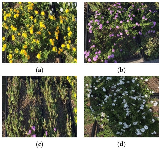 Four species considered in this study: (a) New Gold Lantana; (b) Purple Trailing Lantana; (c) Hardy Ice Plant; (d) White Trailing Lantana.