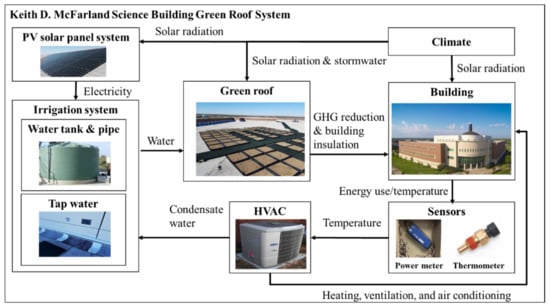 As mentioned in Section 2, a green roof is one of the most important ways to make an area environmentally friendly. The goal of this study is to develop a simulation model for the management of a green roof system. Figure 3 represents a conceptual model of the proposed green roof system involving two water sources such as HVAC condensate water and tap water. In addition, the electricity is supplied by photovoltaic (PV) solar panels to run an irrigation system. In fact, this approach has been adopted in the agro-photovoltaic (APV) system, which utilizes solar energy for crop production [42]. The role of sensors is to collect real-time temperature and electricity consumption data of a building. As a result, the green roof system is expected to reduce GHG emission and energy use of a building.