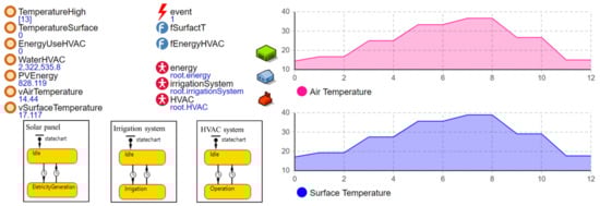 In this study, in order to develop the simulation model, the field experiment data mentioned in Section 2 is utilized. Figure 4 reveals an overview of the simulation model of the proposed green roof system. The simulation is developed via AnyLogic® University 8.6.0 simulation software, Chicago, IL, USA. The model has three agents such as solar panel agent, irrigation system agent, and HVAC system agent. These agents have two states in their state charts to mimic the behavior of each system. To be more specific, if there is no need of water, Irrigation system agent is in the idle state. Otherwise, the system is in busy state to water the plants. Similarly, solar panel agent is only in busy state when the solar radiation is available. HVAC system agent consumes electricity when it needs to maintain the indoor temperate in building. While the simulation run, performance measures (e.g., energy consumption, water use, surface temperature, etc.) are computed via numerical models shown in the following sections in detail.