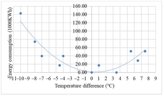 where is air temperature, and is reference indoor temperature. R2 of Equation (2) is 0.8284 so that it can accurately estimate the energy load of HVAC. Figure 5 reveals non-linear relationship between energy consumption and temperature difference. The temperature difference refers to difference between outdoor temperature and reference indoor temperature of 25 °C.