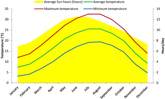 Jordan has various climactic regions, including some which reflect the climate of the Mediterranean and others that have desert features. Weather in Jordan can be separated into four different seasons, where spring and autumn are more conducive to human comfort. The Jordanian capital of Amman is in a zone categorized as sub-humid, in which the summers are hot and dry, and winters have increased precipitation. During winter, when the climate is cooler, the average temperature is approximately 3 °C, whereas in the dry summer period, the average temperature is 34 °C, and the hours of daylight also vary seasonally, between 7 in the winter and 13 in the summer [37], as illustrated in Figure 1.
