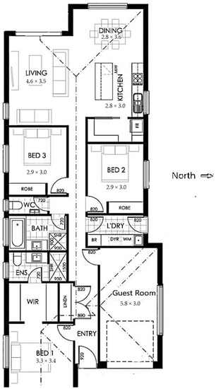 Two entrances to the house were designed: one, through the guest room, and the other, through the main corridor. The size of the guest room window was 1.5 m × 1.5 m, while the master room’s window was 1.0 m × 1.5 m window’s height. In the middle of the house, the laundry and the bathroom were connected though a corridor to two bedrooms facing each other. On the western side of the house were living, dining and kitchen area, sharing one open area. All windows of the building were 1.5 m tall, but varied in width from 0.5 m to 1.5 m.