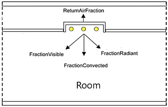 Convected Fraction: Convected Fraction = 1.0 − (Visible Fraction + Radiant Fraction + Return Air Fraction). Regarding return-air ducted bulbs, the return-air fraction refers to the proportion of heat produced by lighting that is convected out of the space into the zone return-air system. In situations where there is no return-air flow, this fraction will be put into the zone air by the software. Generally, the Return Air Fraction should be above zero for return-air ducted bulbs or where natural ventilation is not used for return-air ducting.