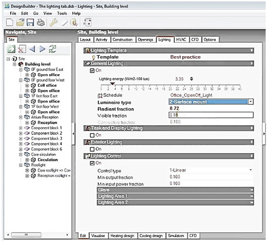 DesignBuilder was used for the calculation of all inside gains, such as lighting, solar heat, home appliances, and occupancy. The primary lighting within the space is accounted for by General lighting (DesignBuilder Software Ltd.: Gloucs, UK). The assumption was that daylight can be used as a replacement if necessary. For the purpose of defining General lighting within DesignBuilder, W/m2/100 lux was used, which is the default setting in versions 2.1 and above. In comparison to the use of W/m2, this technique for defining lighting gains offers certain benefits, specifically that the real level of lighting is related to the type of lighting system with no requirement to refer to activity, and therefore illuminance needs. Hence, in situations where a building is comprehensively equipped with a specific lighting system, but a variety of different activities occur within it, it is generally feasible to enter a value of W/m2/100 lux, once, at the building level, then select the activity for every area, and still produce plausible results for lighting gains.