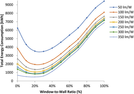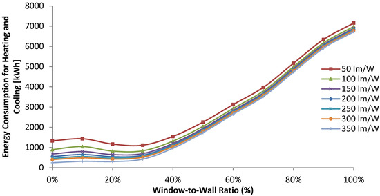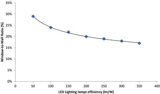 In Figure 9, the relationship between the efficiency of LED lamps (lm/W) for various WWRs is represented graphically. It is evident that, as the LED efficiency increases, a lower windows-to-wall ratio is needed; as can be observed, the WWR decreased to 29%, 24%, 22%, 20%, 19%, 18%, and 17% when the efficiency of the LED lighting lamps rose to 50, 100, 150, 200, 250, 300, and 350, respectively. It is possible to express the relation among the efficiency of the LED lighting lamps (lm/W) and the various WWRs as follows: