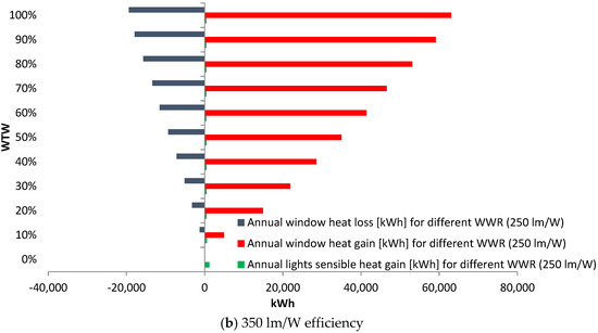 Generally, some heat gain occurs as glazing allows light and solar radiation to enter the building, but some of this heat is lost as result of conduction heat losses via the same glazing. Figure 8 summarizes the overall gains and losses in heat on a yearly basis, where the annual heat gain from lighting and windows is depicted by the green and red bars, respectively, and blue bars show the annual heat loss through windows.