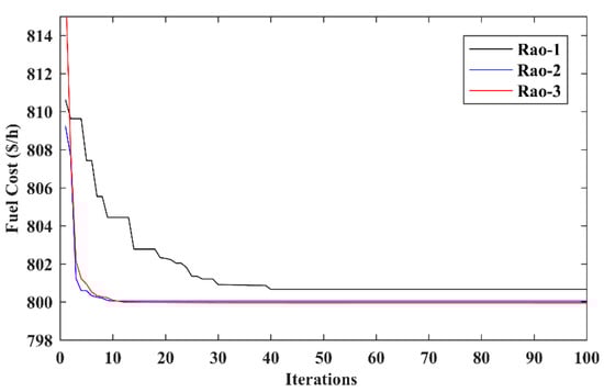 The minimum cost attained by the Rao-3 algorithm is 799.9683 $/h, while Rao-2 and Rao-1 algorithms provided the minimum fuel cost of 799.9918 $/h and 800.4391 $/h, respectively. Table 2 compares the simulation results of Case 1 obtained by the proposed algorithms and other reported algorithms listed in recent literature. The OPF results of the proposed Rao-3 algorithm and optimal control variable settings are presented in Table 3. Based on the outcomes, it is clear that the Rao-3 algorithm provided the least value of the fuel cost as compared to the other methods. This demonstrates the effectiveness of the proposed Rao-3 algorithm as compared to Rao-2 and Rao-1 algorithms, as well as other competitors for this case. The fuel cost convergence characteristics of Case 1 are presented in Figure 2.