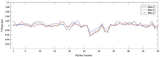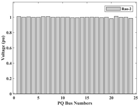 The optimal control variable settings are presented in Table 3, while the load (PQ) bus voltage profile obtained by the Rao-2 algorithm in Case 2 is shown in Figure 3. Based on the OPF results, it is clear that the Rao-2 algorithm provided the least value of the total voltage deviation as compared to the other variants of the Rao method. This demonstrates the effectiveness of the Rao-2 algorithm in comparison to the Rao-1 and Rao-3 algorithms for this case.