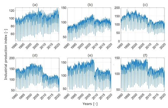 The analyzed data represent the monthly industrial production index for the six abovementioned Italian industrial subsectors. Figure 1 shows the historical industrial production index for the six analyzed industrial subsectors during the period 1990–2020. It shows a clear annual seasonal pattern, and this cannot be neglected when constructing a regression model. This is done by implementing centered seasonal dummy variables [30], which are capable of addressing pre-specified seasonality patterns. In fact, they act as regressors and take the value 1 in the season of the year that presents a repeating pattern and 0 in all other seasons. It can be noted that, without a seasonal adjustment, it would be difficult to process any kind of trend that the series can have, considering the high fluctuations of the data.