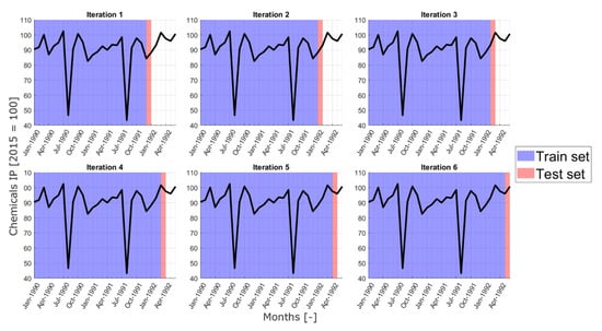 An important step for the VAR model construction is selecting the best number of lagged variables in the system. Information criteria such as Akaike and Hannan–Quinn criteria (AIC and HQC, respectively) are generally used to select the number of lags to be included and to choose the best regression model. Although, since we are not interested in having a good regression, but we are interested in accurate forecasts, such criteria may not be the best choice [29]. On the other hand, the Bayesian criterion (BIC) is based on log-likelihood function (LLF), similar to AIC, and it is used to measure the predictive ability of different models. Nonetheless, such a criterion heavily penalizes complex models, and this may be a conservative choice for model selection when choosing the number of regression parameters [32]. For such reasons, a cross-validation approach has been used. Cross-validation is widely employed in the regression and prediction of time series to assess the accuracy of a forecast model by averaging predictive errors across mutually exclusive data subsamples. Estimates can then be used to select the most accurate model among multiple candidates [32]. In more detail, a time-series cross-validation procedure based on a rolling forecast origin has been performed [29]. This is an iterative process, where the first iteration has consisted in considering a two-year training set in the period 1990–1991. The test set includes a one-step-ahead forecast (i.e., the projection at January 1992) that represents the starting point for the estimation of a forecast error, performed by comparing the result against historical values. In the second iteration, the training set is increased by one month ahead, and the test set is represented by the forecast for February 1992. This procedure is iterated until the training set corresponds to the last month in the historical dataset. Figure 2 shows the first six steps of the procedure, considering the historical values of the Chemicals industrial production index as an example. It can be clearly seen how the training set for the VAR model selection increases at each iteration, while the test set remains frozen at one step ahead.