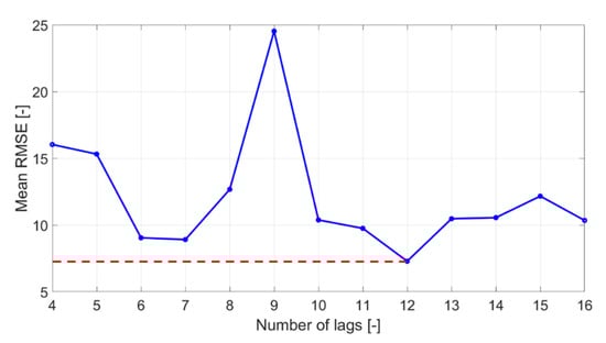 Selection of the number of lags from RMSE minimization as a function of the number of lagged values.