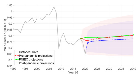 Iron and steel industrial production projections. The light red area encloses the 95% confidence bound related to the pre-pandemic projections, while the light blue area represents the range enclosed within the 95% confidence bounds related to the post-pandemic projections.