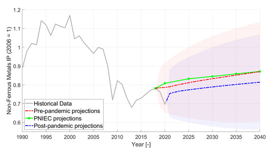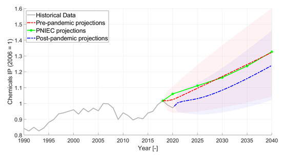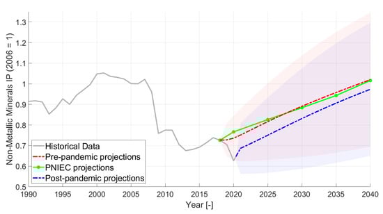 Figure 6 shows the projections for the chemical sector, while the projections of the Non-metallic minerals sector production are reported in Figure 7. Both those sectors present a stronger increasing trend with respect to the iron and steel and Non-ferrous metals, but the computed pre-pandemic VAR projections present, again, a similar behavior to the one discussed above. For Chemicals production, as shown in Figure 6, the post-pandemic projections show a small bouncing effect in the short term, in line with the post-2009 crisis recovery behavior, and no stagnation in the medium term. The pandemic is anticipated to have a very time-limited effect on this set of forecasts, and the growth highlighted by the historical series confirmed both the pre- and post-pandemic projections. The Chemicals sector is the one showing the highest growth rate and the highest absolute growth with respect to the 2006 value, despite the pandemic, but also a wide range between PNIEC/pre-pandemic and post-pandemic projections, with a 6.25% difference. For the Non-metallic minerals production in Figure 7, the short-term bounce is followed by a strong increasing trend, both in the pre-pandemic and the post-pandemic projections. In 2040, the Non-metallic minerals production is anticipated to reach comparable levels with respect to 2006 both in the pre- and post-pandemic projections, with the effects of the pandemic leading to a 4.55% difference in 2040 with respect to the PNIEC/pre-pandemic projections. A steeper growth rate of the post-pandemic projection with respect to the PNIEC/pre-pandemic lines is also visible in the long term.