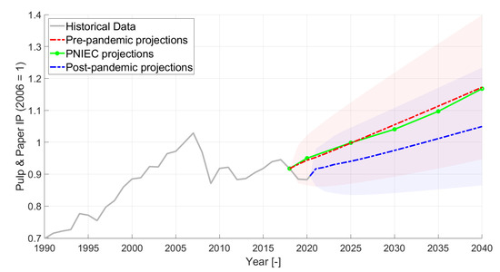 Pulp, paper and printing industrial production projections. The light red area encloses the 95% confidence bound related to the pre-pandemic projections, while the light blue area represents the range enclosed within the 95% confidence bounds related to the post-pandemic projections.