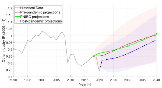 The differences between pre- and post-pandemic projections for the different subsectors in Table 3, as well as in Figure 4, Figure 5, Figure 6, Figure 7, Figure 8 and Figure 9, are mostly related to the reductions registered in 2019 with respect to 2018. In fact, on the one hand, the pre-pandemic projections do not completely catch such a reduction in 2019, and on the other hand post-pandemic projections present an almost full recovery, with 2021 values close to 2019. The Pulp and paper sector is the only exception in terms of a significantly lower long-term trend in the post-pandemic results compared to pre-pandemic. This is mostly due to the autoregressive nature of VAR models, where a longer post-2009 crisis stagnation up to 2021 has led to less optimistic results with respect to pre-pandemic projections.