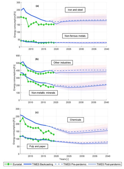 Eventually, concerning total industrial energy demand in Figure 11, the 7% (79 PJ) energy consumption range between the pre- and post-pandemic driver projections for the year 2020 thins to 59 PJ in 2040, but showing a generally increasing trend that is very slow if compared to a steep demand growth in all sectors except Chemicals.