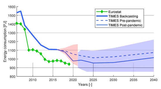 Energy consumption back-casting and projections for the whole Italian industrial sector. using TIMES-Italy. The TIMES-Italy back-casting is benchmarked against Eurostat historical series 2006–2019.