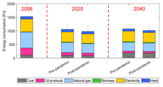 In Figure 12, the detailed industrial energy mix at three selected time steps (2006, the base year; 2020 and 2040) is shown, using pre-pandemic and post-pandemic drivers in 2020 and 2040. It is evident how the application of the TIMES cost optimization algorithm, coupled to the availability of more efficient technologies in the years following 2006, has the greatest impact on the modifications to the energy mix. Indeed, the decreasing energy demand is mostly due to a steep decline (>60% in the two cases) in oil product consumption from 2006 to 2020. Moreover, natural gas shows a considerable decline (40%) from 2006 to 2020, while the use of biomass is more than doubled, but still negligible with respect to the other sources. The analyzed scenario being a business-as-usual case study in which innovative low-carbon technological options can be adopted, but without considering, e.g., the application of carbon capture and storage (CCS) or the prescription of any CO2 emission target, the energy mix in 2040 practically stays the same as in 2020. Nonetheless, coal is the only one among fossil fuels showing a substantial growth (>90% in both cases using pre- and post-pandemic driver projections), which is mainly due to the considerable uptake of the highly efficient and cost-effective HIsarna-BOF steel production technology [34] and the displacement in fuel use for clinker production in the Non-metallic minerals sectors, where oil is almost totally replaced by coal.