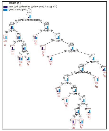 As a result of the procedure, with the use of appropriate quality measures for the division of the group of respondents, 14 classes of respondents were distinguished (C1, … C14)—see end nodes (lists) in Figure 1 and a set of classes in Table 5.
