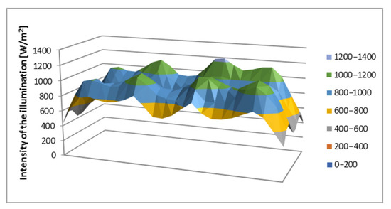 The fundamental objective was to construct an artificial illumination for the measuring compilation, producing appropriate lighting conditions. However, simulating natural light is a complex and challenging task. Although there are standard requirements (IEC 60 904-9) for artificial lighting [17,19,20,21], our goal was to use a smart solution that is available to the general public (e.g., other educational institutions such as secondary schools). In the measurement setup, the maximal intensity Emax = 1245 W/m2, the minimal intensity Emin = 407 W/m2, and the inhomogeneity of illumination is ΔE = 50.73%. The median intensity is 874 W/m2, and the modus intensity is 1000 W/m2. The light power is 490.48 W [21,22]. The halogen reflectors at our disposal did not meet the standard criteria and need to be developed in the future. Figure 1 shows the lightning intensity distribution of the sunlight simulator.
